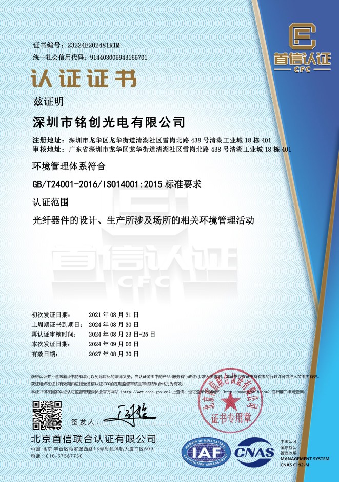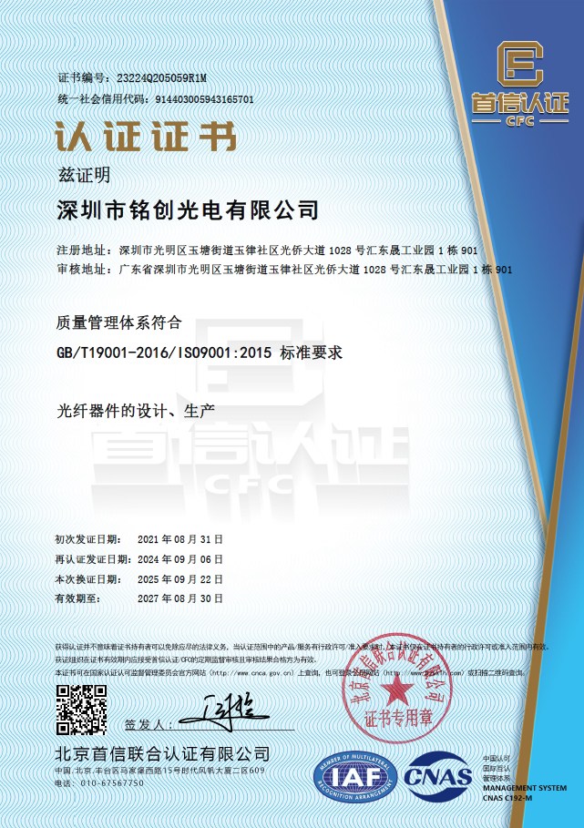 深圳市铭创光电有限公司于2012年成立,公司总部位于深圳市光明区,是深圳市专精特新企业和创新型中小企业,通过了IS09001-2015质量管理体系认证和IS014001-2015环境管理体系认证;经过多年的持续研发投入和专注发展,铭创光电已发展成光纤激光器、激光雷达、光纤传感、激光医疗和激光通信等领域的综合性光纤产品服务商。